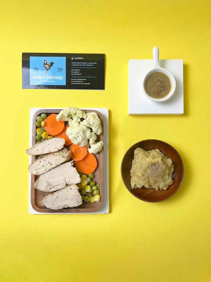 Indulge in the Juiczy Honey Mustard Breast Bento, a satisfying and convenient meal option. Our tender and flavorful Original Chicken Breast, cooked sous vide for perfection, takes center stage in this bento. Paired with handcrafted mashed potatoes and a selection of fresh vegetables, this bento offers a balanced and nutritious meal.