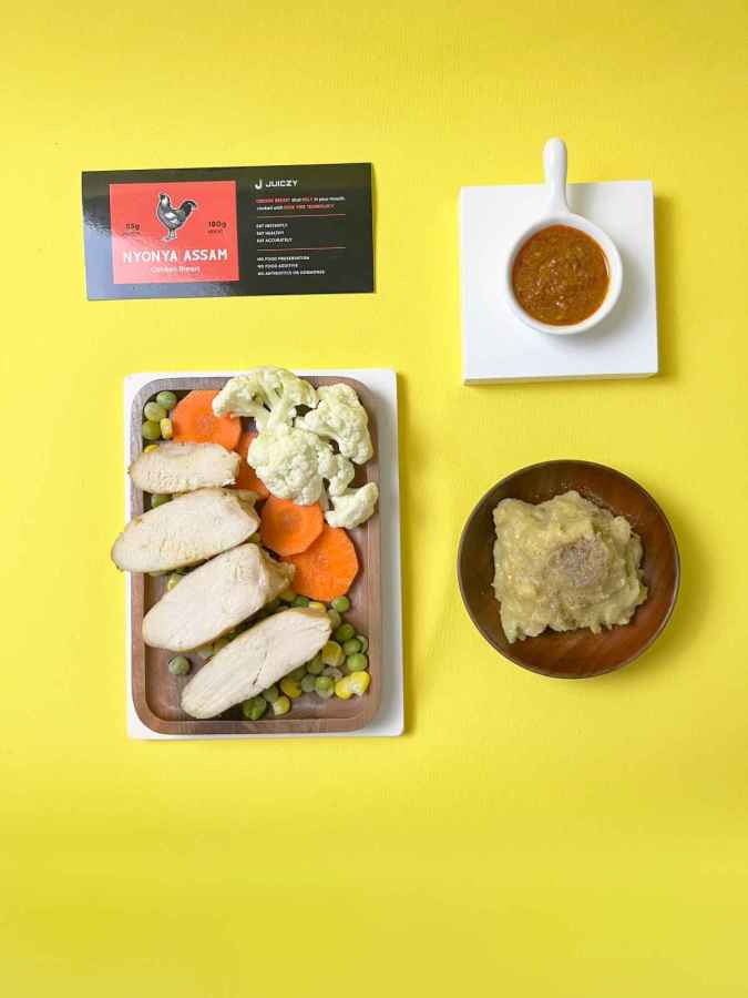 Indulge in the Juiczy Nyonna Assam Chicken Breast Bento, a satisfying and convenient meal option. Our tender and flavorful Original Chicken Breast, cooked sous vide for perfection, takes center stage in this bento. Paired with handcrafted mashed potatoes and a selection of fresh vegetables, this bento offers a balanced and nutritious meal.