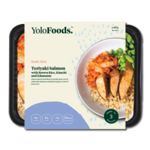 Salmon glazed and baked in teriyaki sauce served with fresh edamame and kimchi salad on a bed of brown rice.